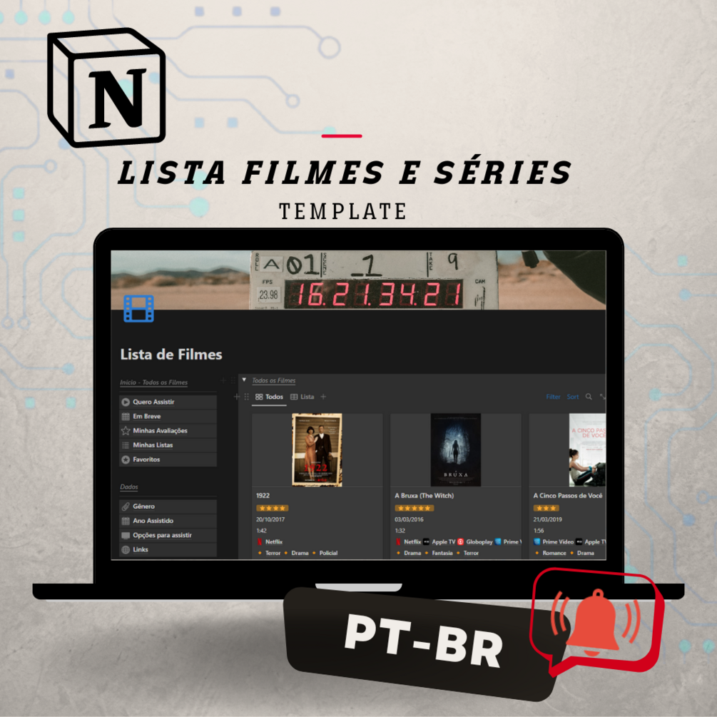 Este modelo do Notion em PT-BR permite que você organize perfeitamente a lista de seus filmes e séries favoritos.