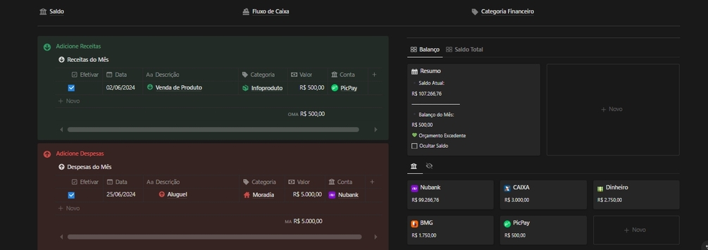 • Registro de Entradas e Saídas: adicione e categorize suas transações de forma rápida e fácil.